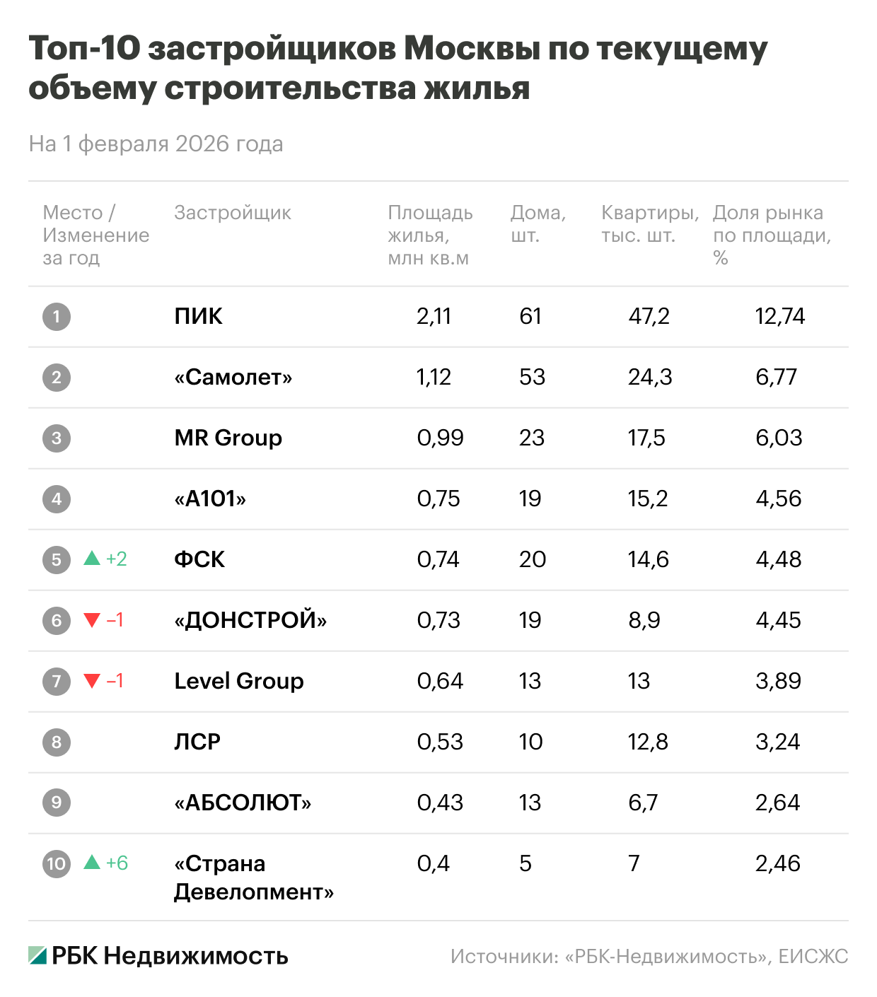 В рейтинге девелоперов учитываются возводимые жилые дома и комплексы апартаментов из проектных деклараций, опубликованных в ЕИСЖС на 1 февраля 2026 года. Рейтинг «РБК Недвижимости» «Топ-10 застройщиков Москвы» публикуется регулярно в начале каждого месяца.